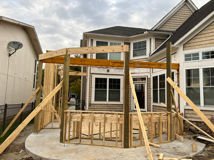 Patio addition including roof structure with skylights, fireplace with TV cutout, grille and bar.